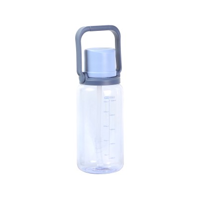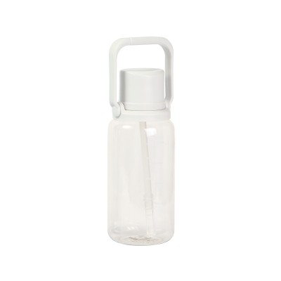 Botella de pared sencilla fabricada en tritán, escala en milímetros y onzas. Incluye popote y agarradera en tapa. Capacidad de 1,100 ml. Medidas: 24.5x9 cm.