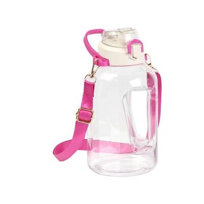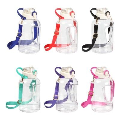 Botella jumbo de plástico transparente con capacidad de 1.4 litros (48 oz) , tapa con botón de seguridad, correa de color con arnés y agarradera, su tapa en rosca es ideal para mantener seguro el liquido de la botella, y su correa de color con arnés desmontable se puede ajustar a tu gusto . Medidas: 23.5x13 cm.