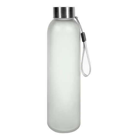 Capacidad 500 ml. Vidrio y acero inoxidable 201. Botella de vidrio con acabado frosty. Tapa de acero inoxidable, aro de silicona antiderrame y correa de tela reforzada. Presentada en caja de regalo