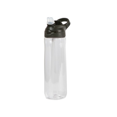 Botella con cuerpo transparente y tapa con bloqueo de seguridad, cuenta con boquilla de silicona y agarradera de color, fabricada en tritán y ABS. Capacidad de 750 ml, peso de 183 g. Medidas: 26.5x7.5 cm.