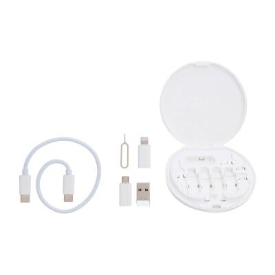 Caja de almacenamiento de plástico con cables adaptadores y soporte para celular que incluye; 1 tipo USB, 1 tipo C, 1 lightning, 1 Micro, 1 llave Sim y 3 espacios para Micro/ Nano Sim. Medidas: 8.4 alto x 8.4 ancho