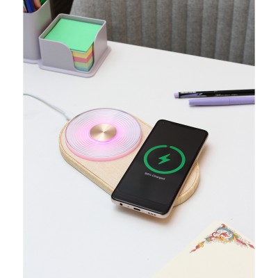Cargador inalámbrico de 15W con lámpara táctil de colores. Este producto tiene un diseño estético, creativo y simple. Puede ser usado en el hogar o en la oficina. Este cargador es compatible con cualquier teléfono móvil con tecnología Qi. También soporta procesos de carga inalámbrica rápida a 5W, 7.5W, 10W. Medidas: 9x16x2 cm.