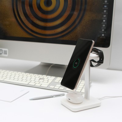 Cargador inalámbrico 3 en 1  fabricado en plástico ABS y metal, carga a través de cable USB (incluido). Apto para dispositivos con tecnología Qi. Cuenta con varios espacios de carga lo que te permite cargar tu celular, audífonos y reloj al mismo tiempo. Su diseño compacto y elegante es ideal para cualquier espacio.Incluye caja de cartón individual. Medidas: 16.5x11.3 cm.