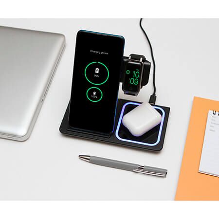Cargador inalámbrico 3 en 1, con tecnología Qi. Ideal para carga inalámbrica de teléfonos celulares, relojes inteligentes y audífonos inalámbricos. Carga a través de cable USB (incluido). Incluye caja de cartón individual. Carga todo en un solo lugar. Medidas: 16.5x14.1 cm.