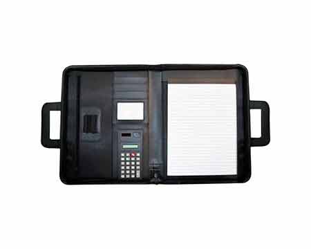 Portafolio ejecutivo con hojas rayadas y calaculadora.