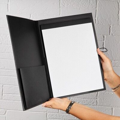 Carpeta con práctico clip metálico y soporte retráctil en la parte superior. Incluye block de 30 hojas con retícula de puntos y compartimento interno. Su elástico ayuda a mantenerla cerrada y evitar extraviar documentos. Utilizala como carpeta o como tabla para encuestas, ideal para entornos profesionales o académicos. Medidas: 23.3 x 32.2 cm