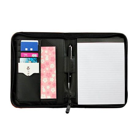 Carpeta tipo portafolio fabricada en curpiel con cierre, block de 30 hojas rayadas, porta pluma y compartimentos interiores. No incluye pluma. Medidas: 24.5x18 cm.