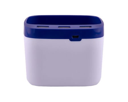 Lapicero HUB de 3 puertos USB con iluminación. Su novedoso diseño permite combinar su uso como lapicero y portacelular. Su iluminación LED en color azul dará al lugar de trabajo un ambiente decorativo y funcional. Presentación: caja en color blanco. Medidas: 9.5 x 9.5 x 7 cm
