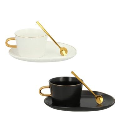 Taza de cerámica con cuchara de acero inoxidable y plato de cerámica. Medidas: 18 alto x 18 ancho