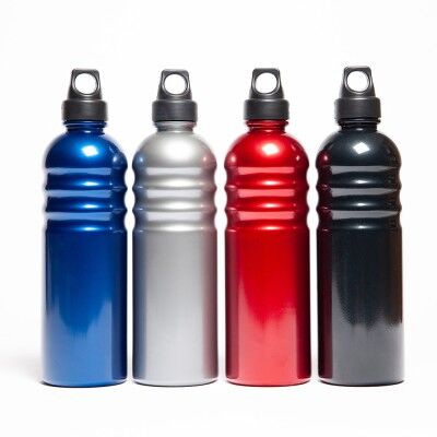 Cilindro de plástico PET con terminado metálico con tapa de rosca anti derrames y capacidad de 1000 ml. Libre de BPA y certificación FDA.