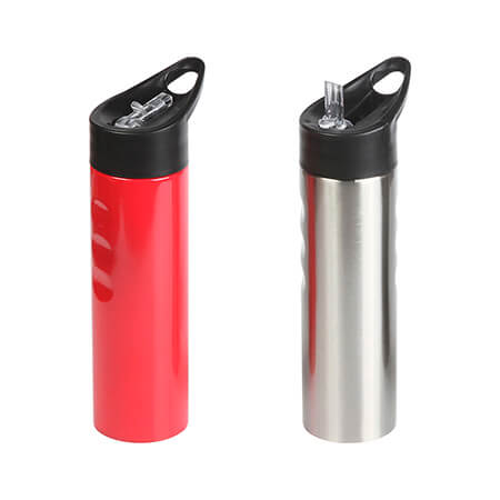 Cilindro fabricado en acero inoxidable con boquilla y popote, capacidad de 750 ml, con agarradera en la tapa, y en la parte lateral del termo se encuentra un molde para mejor agarre. Medidas: 24x7.3 cm.