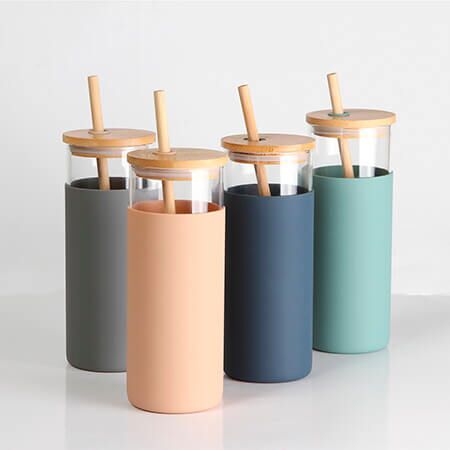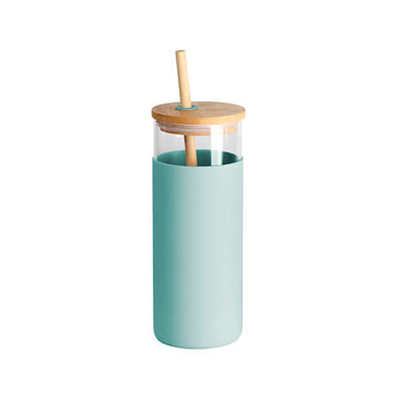 Cilindro de vidrio de borosilicato con manga de silicón, tapa de bambú con anillo de silicón y popote de bambú. Capacidad de 450 ml (15 oz). Incluye caja de cartón individual. Medidas: 18x6.6 cm.