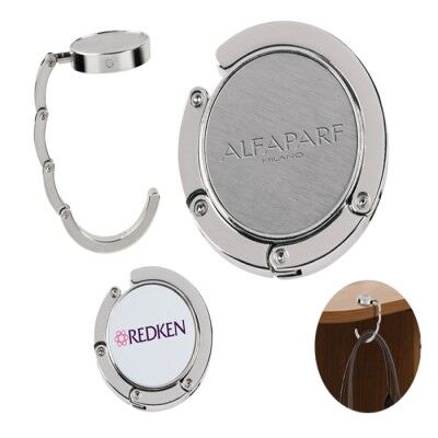 Colgador plegable para bolsa. Modelo para grabado láser y modelo con recubrimiento en color blanco para gota de resina y tampografía. Presentación: caja individual en color negro. Medidas: Ø 4.5 x 0.7 cm