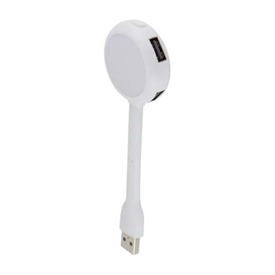 Concentrador con 4 puertos USB 2.0 y luz LED. Incluye botón para encender y apagar la lámpara. Cuerpo flexible. No requiere baterías. Medidas: 4.5 x 14.5 cm
