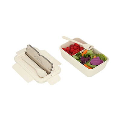 Contenedor para alimento de wheat Straw, con 2 compartimentos para alimentos,1 para cubiertos en la parte superior y soporte para celular. Incluye cuchara y tenedor. Capacidad de 1100 ml. Medidas: 8 alto x 20.5 ancho