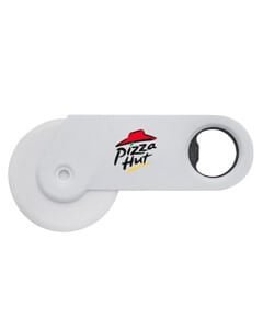 Cortador de plástico para pizza con destapador de metal para botellas. Medidas: 13 x 6.2 x 0.9 cm
