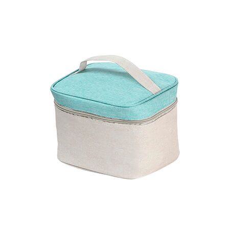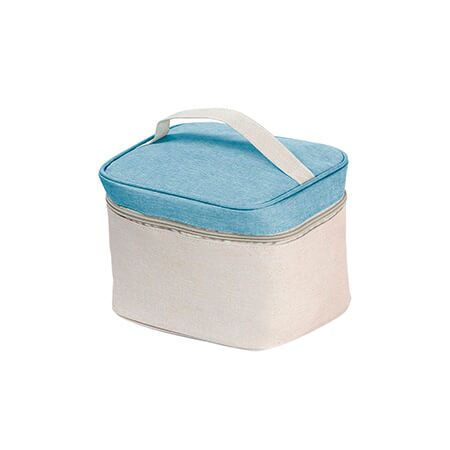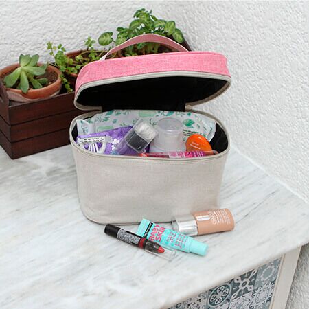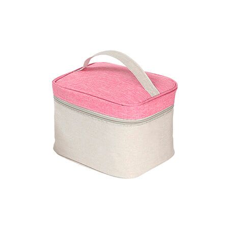 Cosmetiquera bi-tono fabricada en poliéster, bolsa de maquillaje portátil, con detalle de color en la parte superior, cuenta con una asa en la parte superior. Medidas: 15x22 cm.