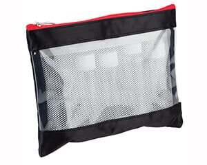Cosmetiquera para viaje con cierre. Contenido: 5 frascos de plástico, uno de ellos con atomizador, así como embudo. Medidas: 19.5 x 15.5 cm