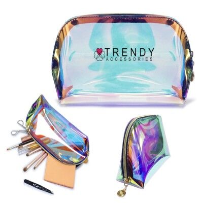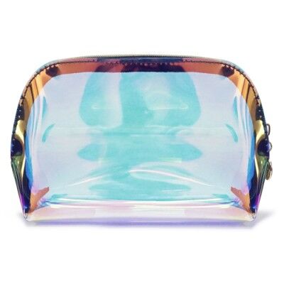 Cosmetiquera de efecto tornasol. Material repelente al agua. Cuenta con cierre metálico. Medidas: 21 x 12 x 7 cm