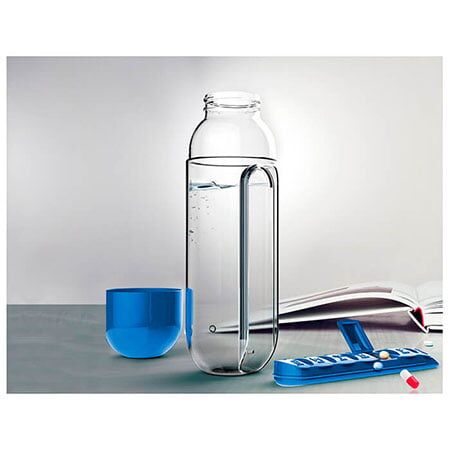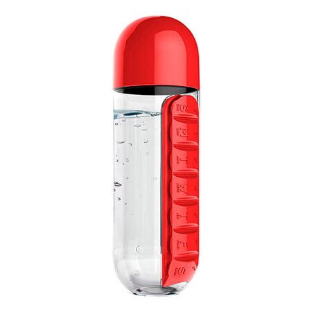 Botella fabricada en Tritan, pastillero integrado con 7 compartimentos, uno para cada día de la semana, capacidad de 600 ml (20 oz). Medidas: 23.5x7.5 cm.