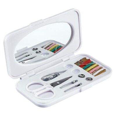 Incluye botones, ensartador de aguja, tijeras, hilo, agujas, seguros y estuche con espejo. Medidas: 11.5 x 6.3 cm