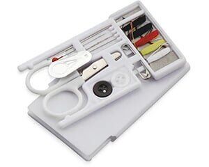 Costurero de plástico con tapa deslizable. Incluye: tijeras, ensartador de agujas, botones, seguro, hilo, agujas y alfileres. Medidas: 8.5 x 5.2 cm