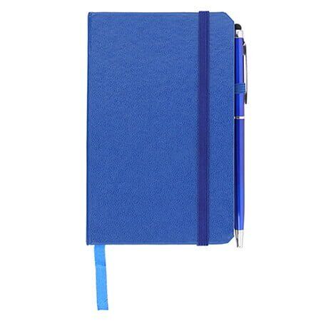Mini libreta de poliuretano con banda elástica para sujetar cubierta, separador y 75 hojas rayadas. Incluye bolígrafo con goma touchscreen. Medidas: 14 alto x 8.5 ancho
