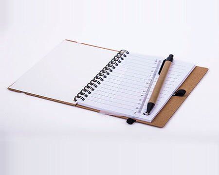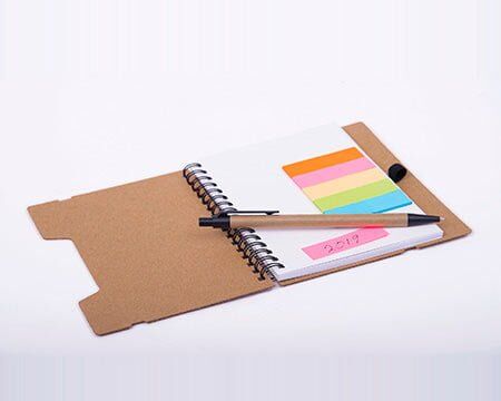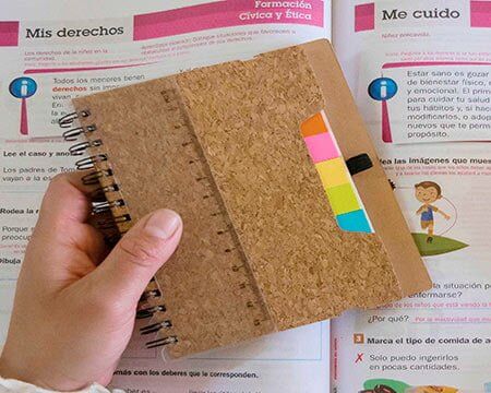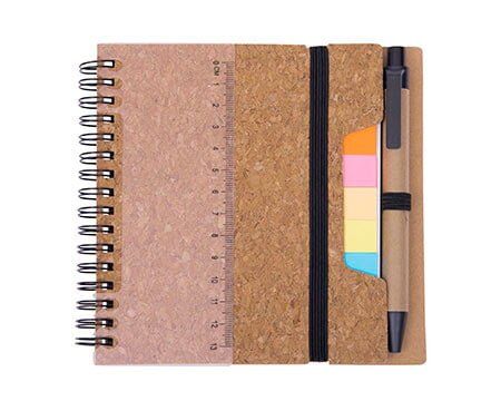 Libreta ecológica de 60 hojas rayadas (160 páginas) con arillo metálico en color negro y cubierta de corcho. Incluye regla plástica, banderas adhesivas, bolígrafo de papel reciclado y banda elástica para sujetar.