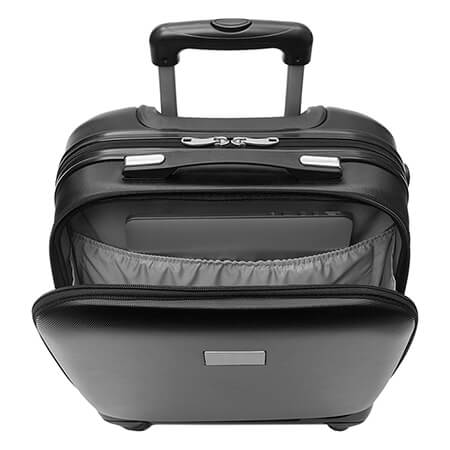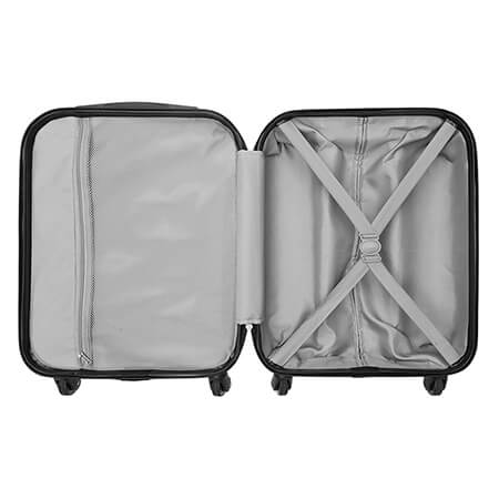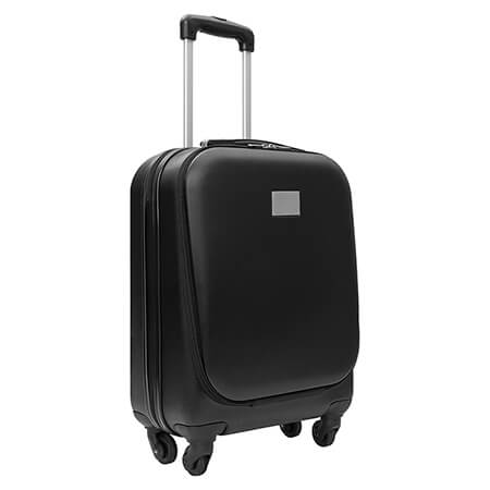 40 x 14 x 44 cm. Capacidad 24 litros. ABS. Maleta "Atlanta" con 4 ruedas con giro 360°. Sistema Trolley. 2 posiciones, manija extensible hasta 54 cm. Compartimento frontal con espacio acojinado para guardar laptop, celular y bolígrafos. Compartimento principal con cintas elásticas cruzadas y un bolsillo de red. Placa metálica de 6 x 4 cm. para grabar. Candado de combinación numérica.
