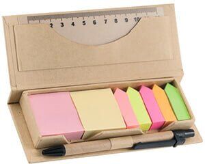 Estuche ecológico de notas adhesivas. Incluye bolígrafo de papel reciclado y regla plástica. Medidas: 16 x 6.5 x 2.3 cm