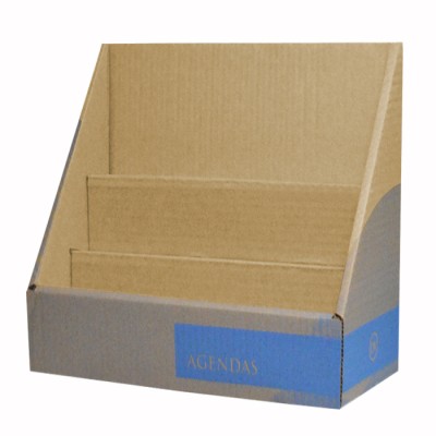 Exhibidor de cartón para agendas, cuenta con 4 niveles que permiten colocar 2 agendas por nivel, diseño resistente y fácil de armar. Medidas: 38 x 31 x 16 cm