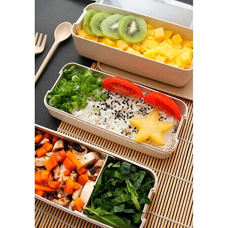 Contenedor para alimentos fabricado en 25% fibra de trigo y 75% polipropileno; con 5 compartimentos, tapa transparente de plástico AS y cubiertos (tenedor y cuchara) fabricados en el mismo material. Capacidad de 900 ml. Gracias a su construcción con materiales de alta calidad, este contenedor es resistente y duradero, asegurando que tus alimentos se mantengan frescos y seguros durante tus desplazamientos diarios. Medidas: 18.4x8 cm.
