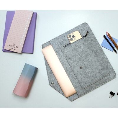 Funda para laptop fabricada en fieltro. Es una opción elegante y funcional para proteger y transportar tu laptop de manera segura, con un detalle de curpiel que agrega un toque de estilo.Cuenta con un bolsillo frontal con cierre, que ofrece un espacio conveniente para guardar accesorios esenciales. Medidas: 24x34 cm.