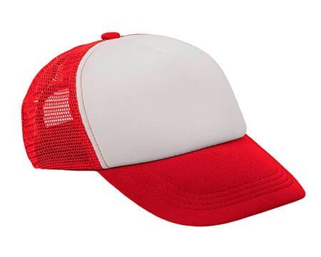 Gorra en poliéster para niños con amplio frente acolchonado y 4 gajos en malla. Ajuste con broche de plástico. Medidas: Circunferencia 54 cm