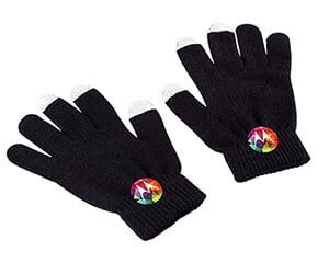 Guantes negros de fibra acrílica, especiales para utilizar con dispositivos touch. Las puntas de los pulgares, indice y medio en color gris. Unitalla.