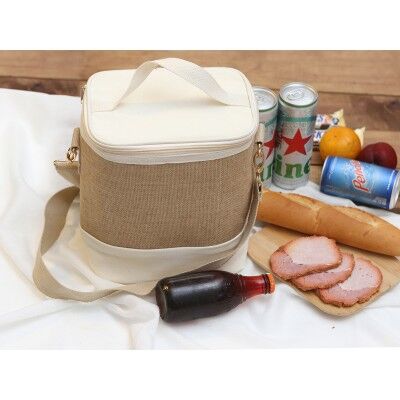 Hielera fabricada en algodón y yute, con relleno de espuma de polietileno y forro elaborado en PEVA con correa. Medidas: 21x14x13 cm.
