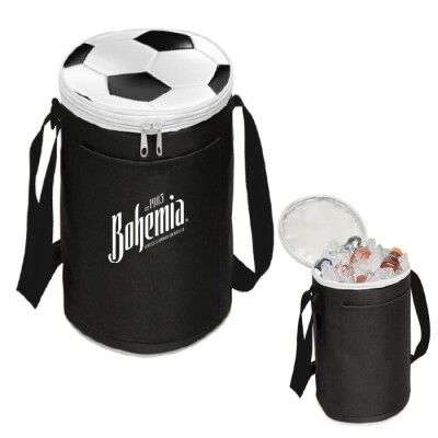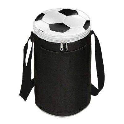 Hielera circular con diseño de fútbol, cubierta cosida e interior termosellado en plástico anti escurrimiento. Cuenta con un compartimento frontal y correa ajustable. Medidas: Ø 24 x 24 cm