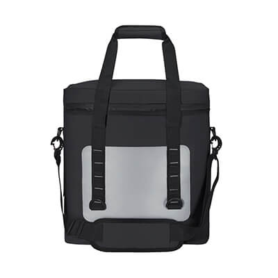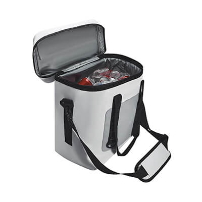Interior y exterior plastificado impermeable. Bolsa principal con cierre, bolsillo frontal. Incluye asa de mano con velcro y correa larga ajustable con soporte acojinado. Capacidad para 36 latas. Medidas: 35 x 38 x 20 cm