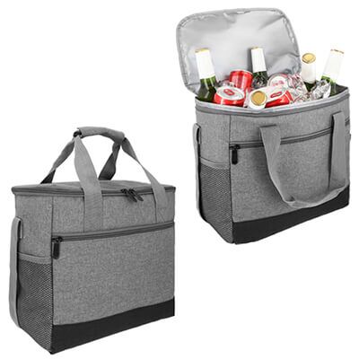 Hielera de poliéster con interior impermeable plastificado, 2 asas con broche de velcro, 1 correa ajustable, 2 compartimentos de malla laterales y 1 compartimento exterior con cierre. Medidas: 29 alto x 29 ancho
