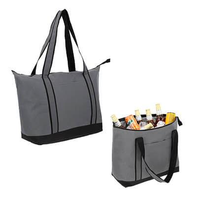 Hielera rectangular con 2 compartimentos, asas superiores, interior impermeable plastificado y cierre. Medidas: 34 alto x 55 ancho