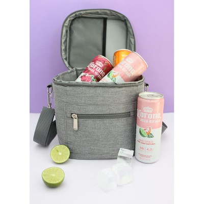 Hielera térmica fabricada en poliéster con forro de aluminio, bolsillo frontal, bolsillo interno de malla en la parte superior de la tapa de la hielera, correa para hombro ajustable desmontable ajustables lo cual te brinda la posibilidad de adaptarla a tu comodidad y asa superior. Medidas: 22.8x18.2 cm.