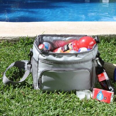 Hielera / Lonchera térmica fabricada en poliéster con forro de PU; con bolsillo frontal con cierre, bolsillos laterales de malla, asa superior con refuerzo en las orillas y correa para el hombro ajustable, la cual es desmontable. Medidas: 24x29 cm.