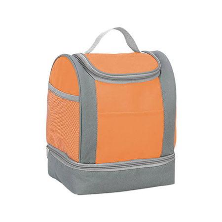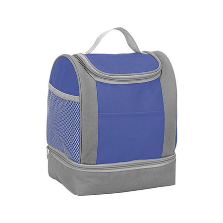 Lonchera doble fabricada en nylon y bolsa tipo red a un costado, con múltiples compartimientos, con detalles en color gris. Medidas: 25x20 cm.