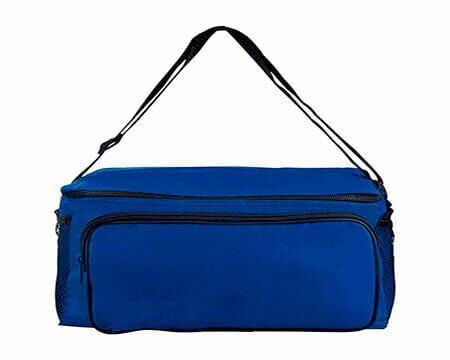 Interior metalizado plastificado e impermeable. Bolsa principal y frontal con cierre. Bolsas laterales de red. Incluye correa ajustable. Capacidad para 12 latas. Medidas: 29 x 16 x 23 cm