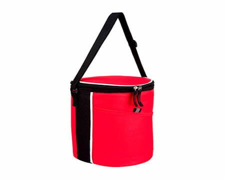 Interior plastificado impermeable. Bolsa principal con cierre y bolsa frontal. Incluye correa ajustable. Capacidad para 6 latas. Medidas: 20 x 24.5 cm