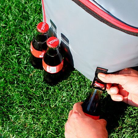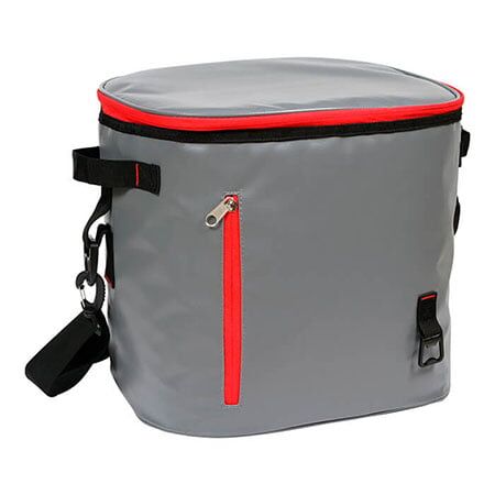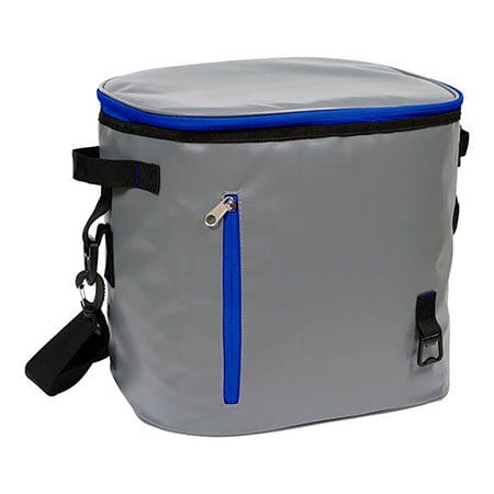 Hielera fabricada en PVC (lona) con destapador y compartimiento en el lado frontal, con correa ajustable y retirable, con asas en los costados para mayor comodidad al momento de transportar, cuenta con detalles de color en los cierres. Medidas: 31x33 cm.