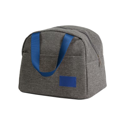 Lonchera fabricada en poliéster catiónico con forro de aluminio, Correas de nylon, bolsillo frontal y detalle en curpiel. Medidas: 19x25 cm.