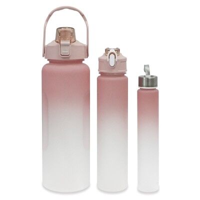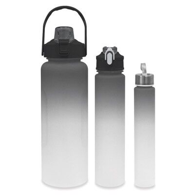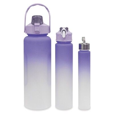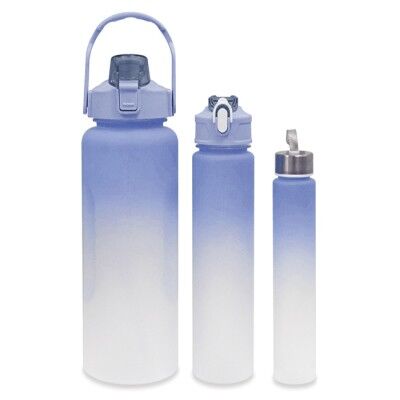 Juego de 3 cilindros deportivos de plástico traslúcido con degradado en la parte superior de color y tapa de rosca en color sólido. El cilindro más grande, cuenta con escala impresa en el cuerpo del cilindro, tapa con asa y boquilla con tapa protectora con seguro. CAP. 2 LT.; El Cilindro mediano tiene tapa con boquilla con tapa protectora con seguro. CAP. 750 ml. y el cilindro más pequeño cuenta con tapa plateada y jareta de cinta gris. CAP. 300 ml. Medidas: Cilindro Grande: Ø 11 x 30 cm / Mediano: Ø 7 x 26 cm / Chico: Ø 4.8 x 21 cm