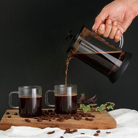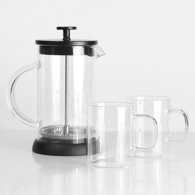 Juego de prensa francesa con 2 tazas de cristal, fabricado en vidrio de borosilicato, con tapa de acero inoxidable y plástico, émbolo de acero inoxidable y base de TPR, capacidad de prensa de 600 ml, tazas de 230 ml. Incluye caja de cartón por set. Medidas: Prensa: 18.2x14.5 cm. Taza: 11x6.3 cm.