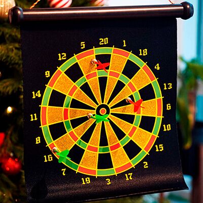Juego de dardos magnéticos con telón de poliéster enrollable y asa para colgar. Incluye 4 dardos, tablero magnético con diversos blancos y estuche cilíndrico de cartón. Medidas: 42 alto x 37 ancho